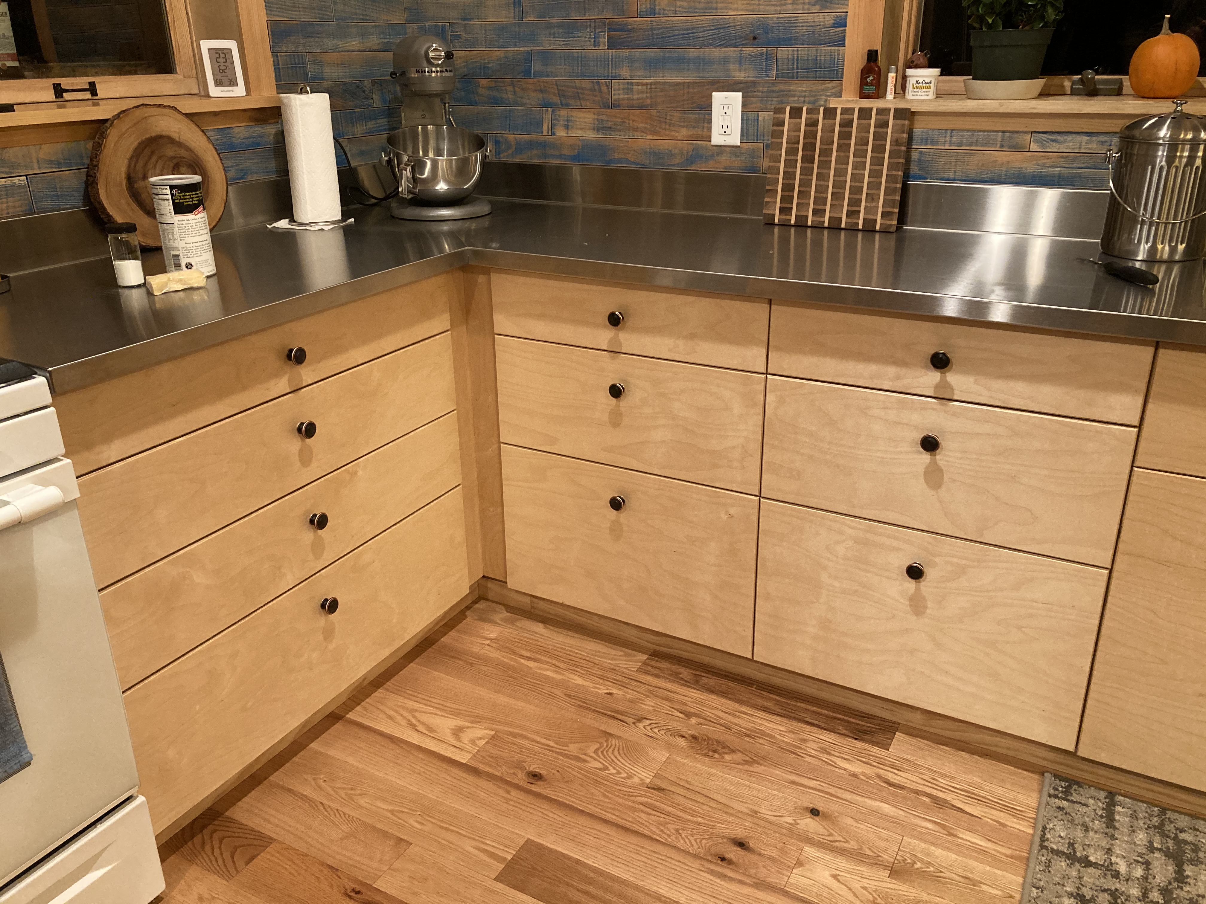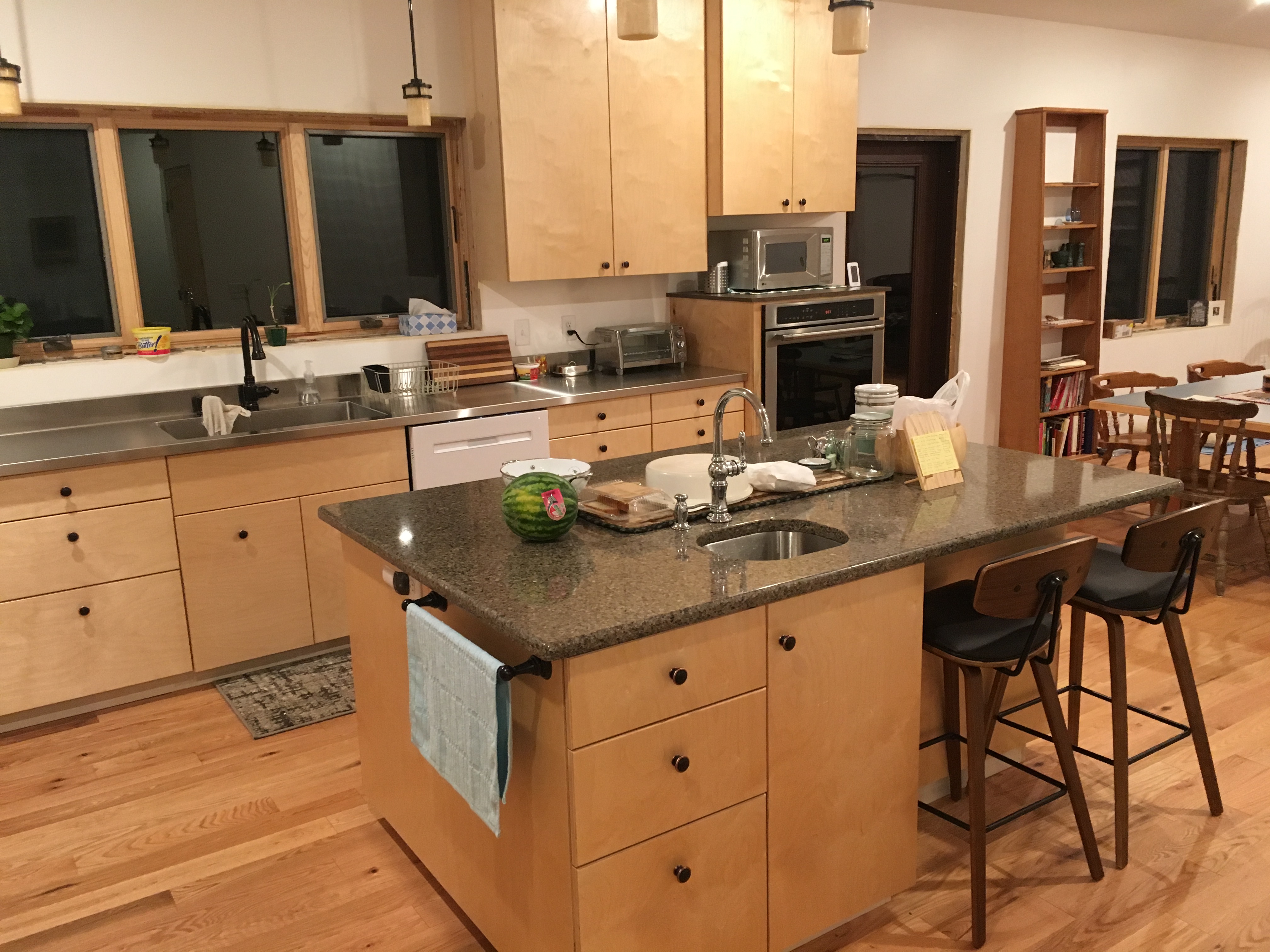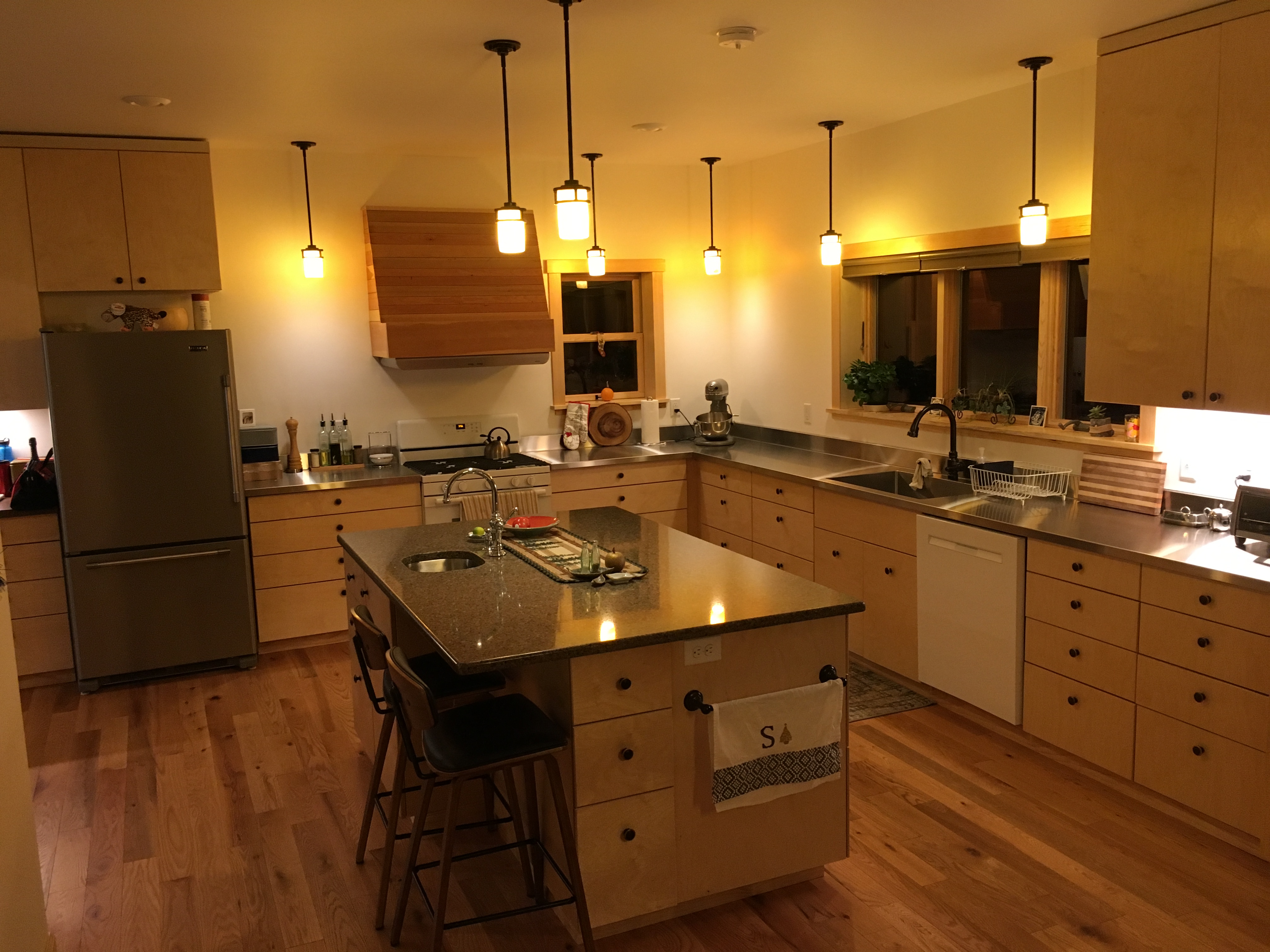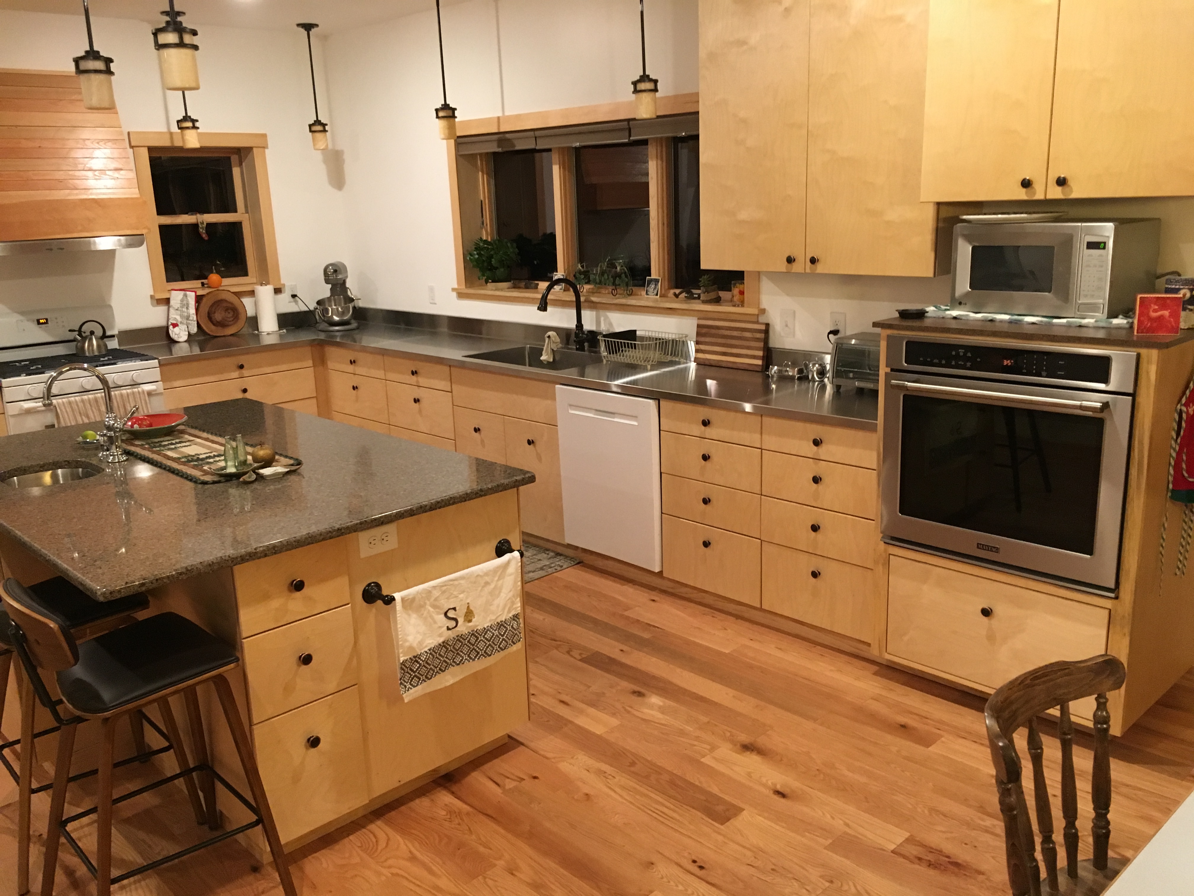This kitchen features sustainably forested Baltic Birch for the base and upper cabinets. The full overlay doors and drawers (without face frames) maximizes the storage in this custom kitchen. The perimeter countertops are stainless steel with an integral sink while the island features a quartz counter.