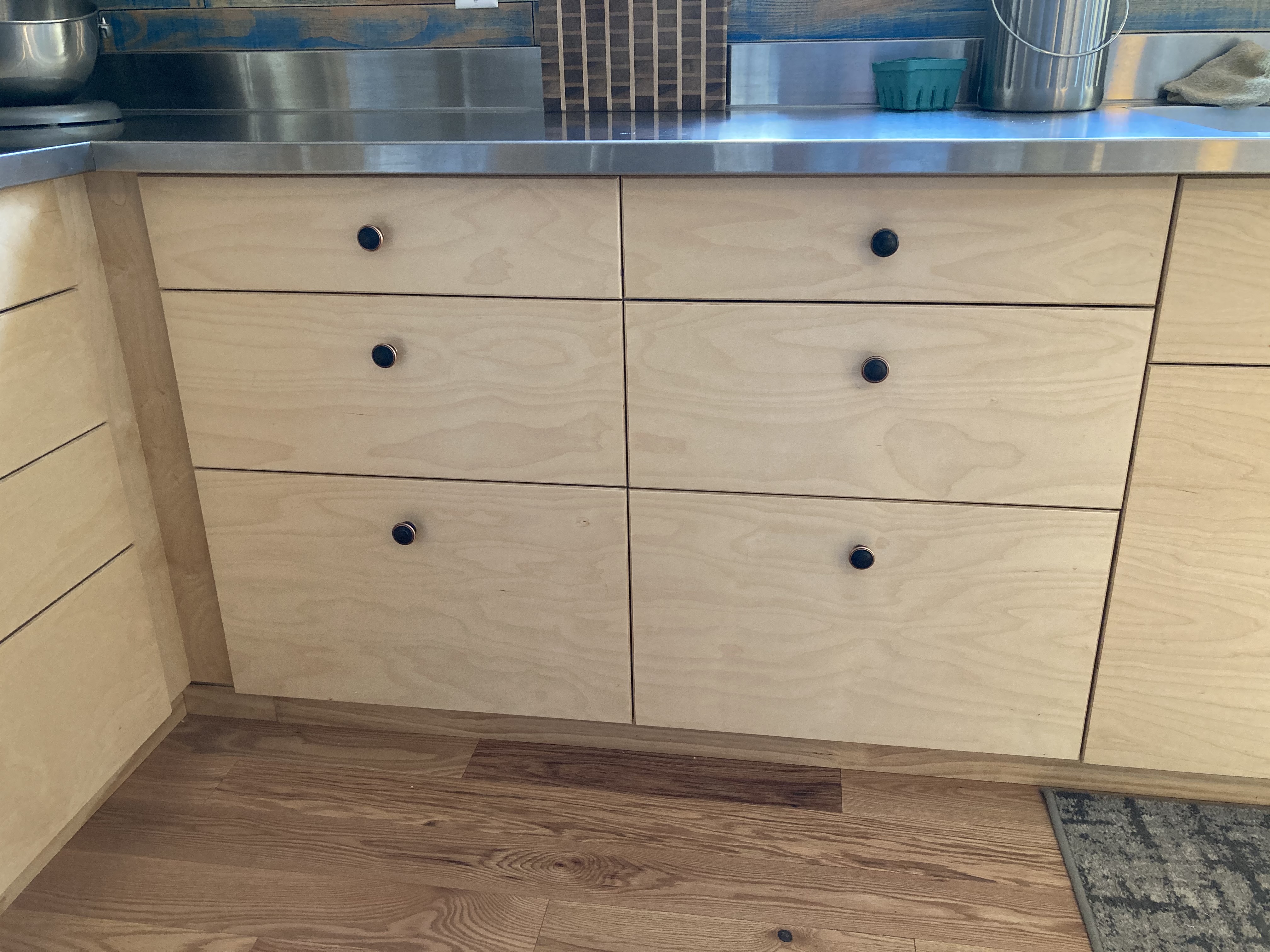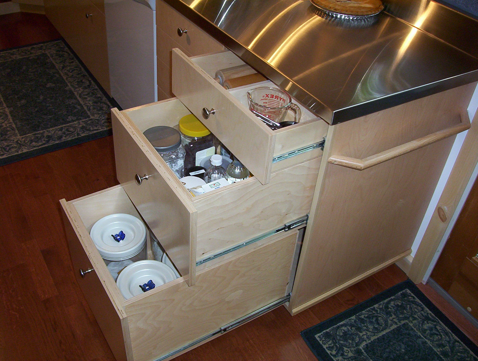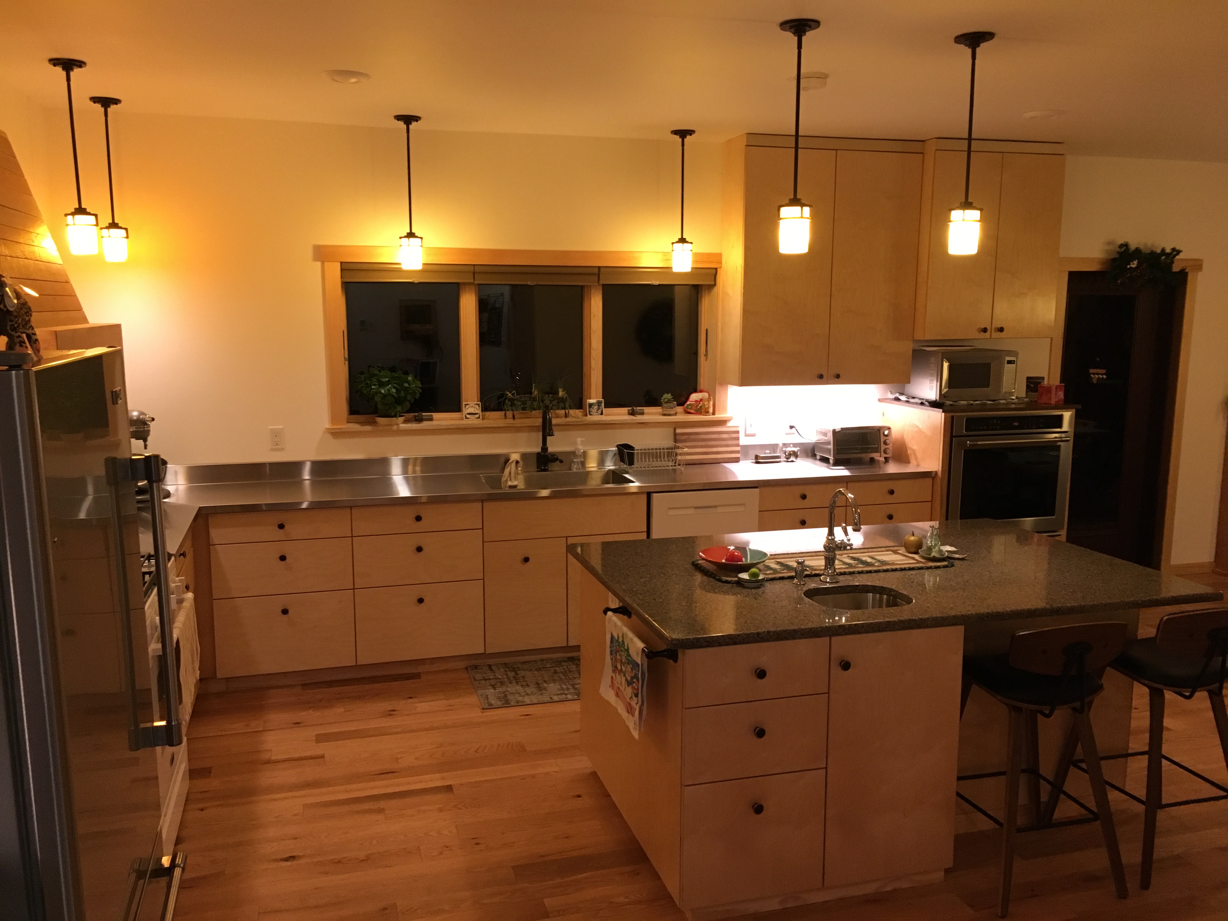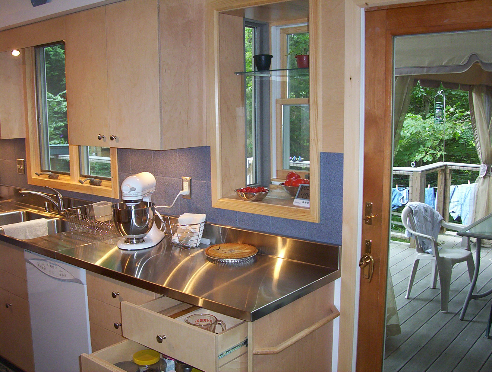 This kitchen features sustainably forested Baltic Birch for the base and upper cabinets. The full overlay doors and drawers (without face frames) maximizes the storage in this custom kitchen. The perimeter countertops are stainless steel with an integral sink while the island features a quartz counter.