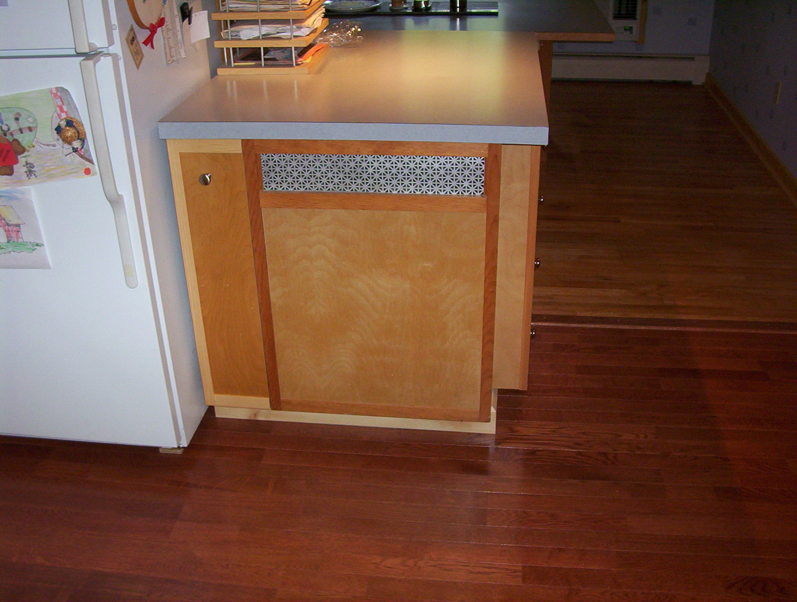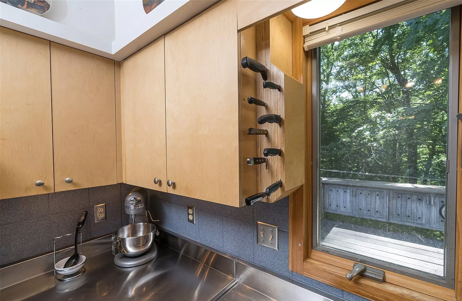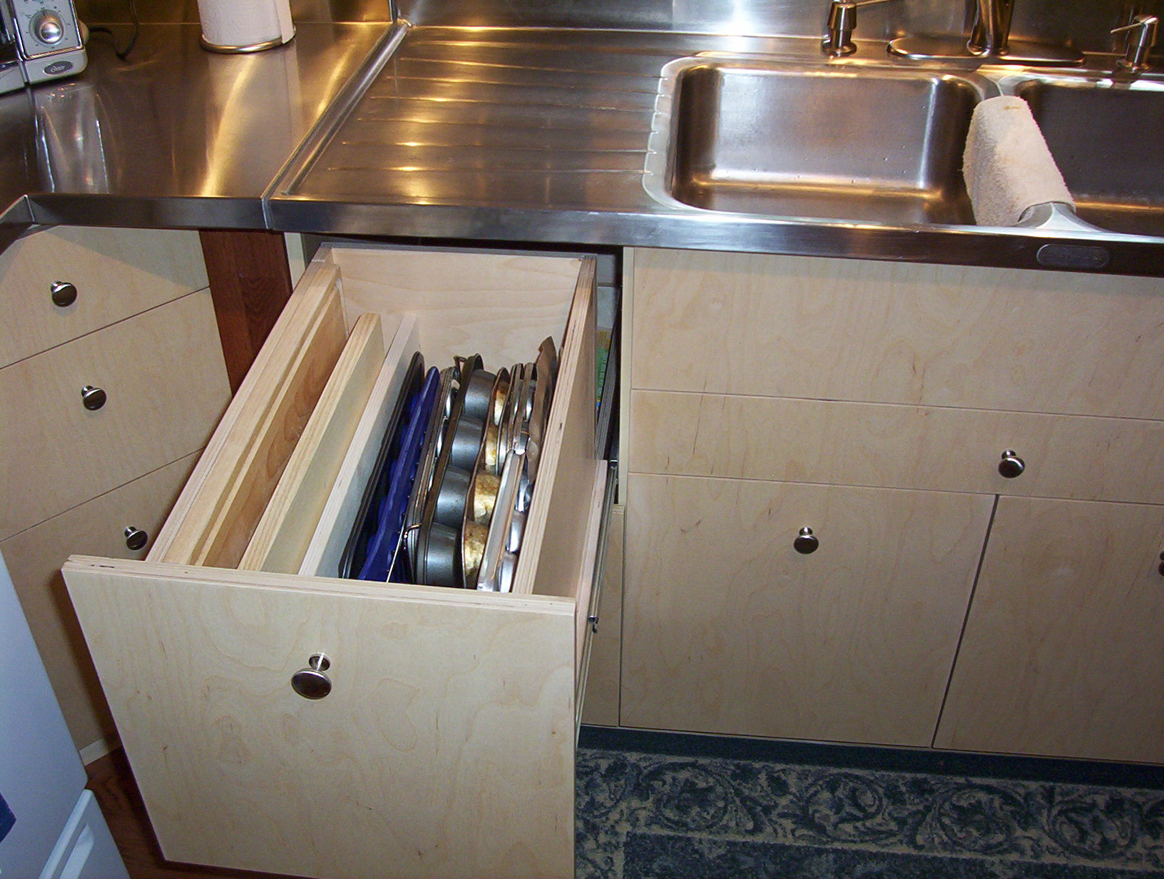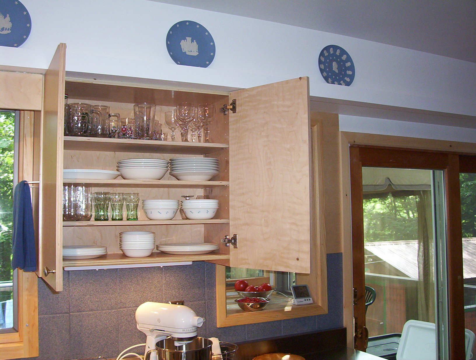 This kitchen features sustainably forested Baltic Birch for the base and upper cabinets. The full overlay doors and drawers (without face frames) maximizes the storage in this custom kitchen. The perimeter countertops are stainless steel with an integral sink while the island features a quartz counter.