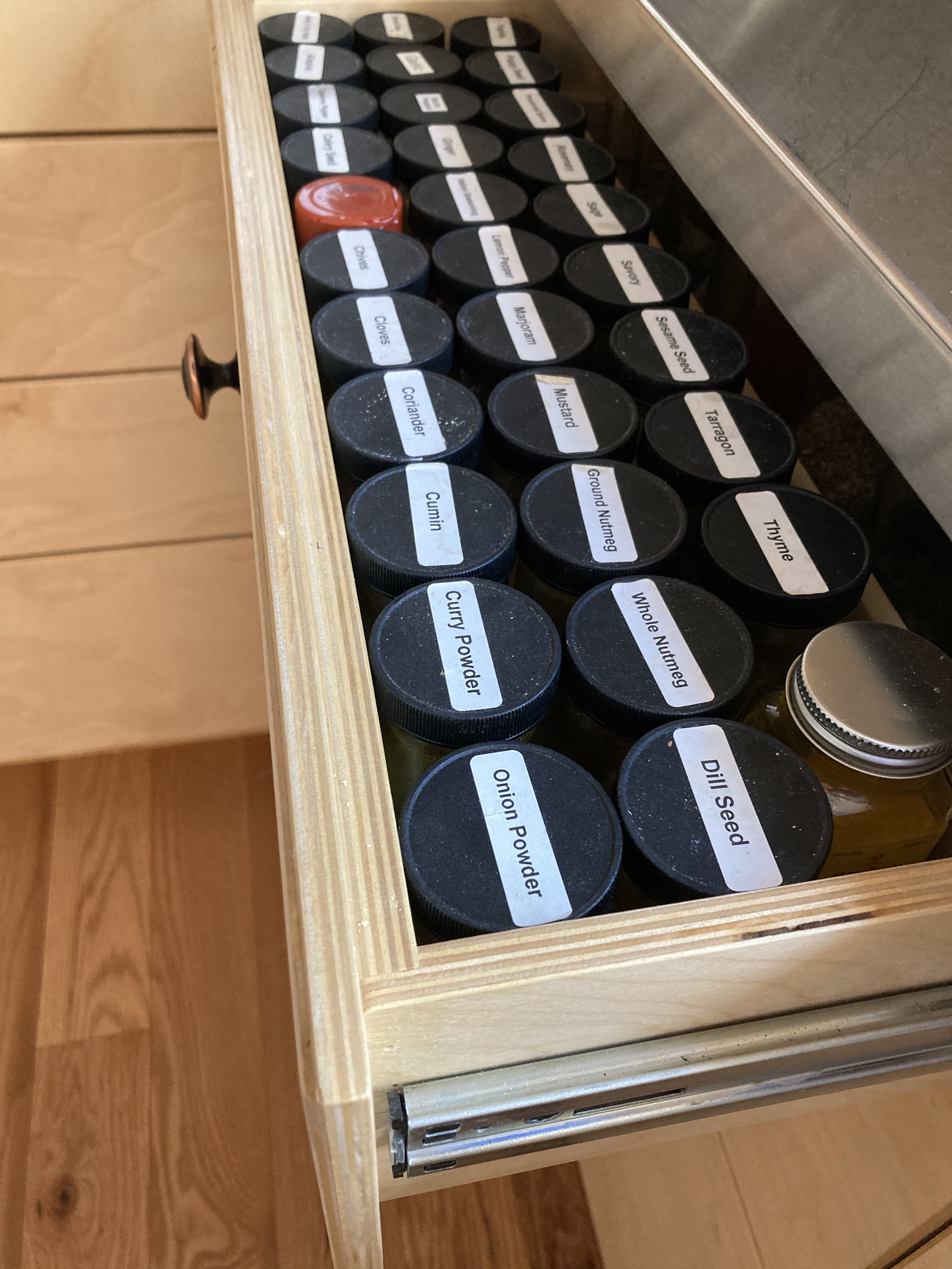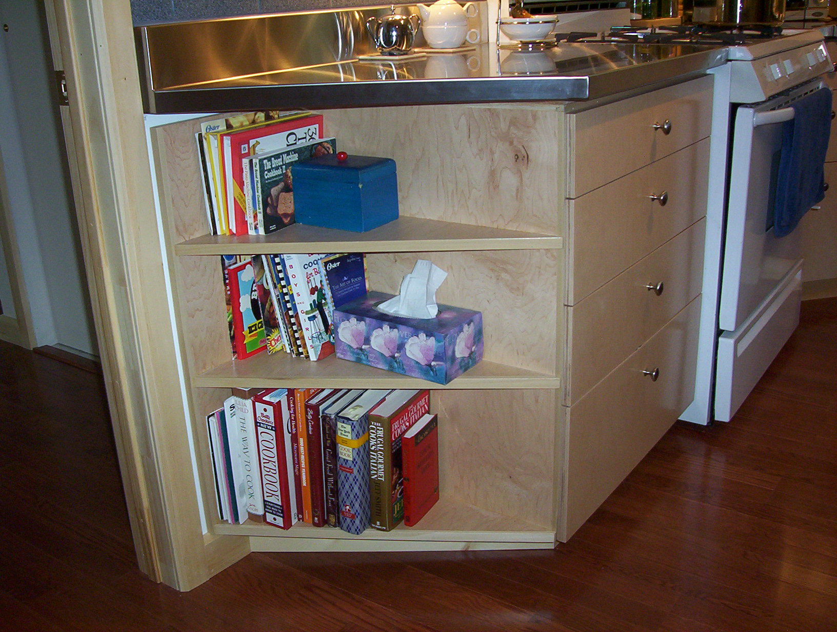 Custom storage is standard with our cabinet work. Drawer configuration can be optimized so that your canisters, pans, cutting boards, and everything else will have a home. In one example, a lower pantry cabinet was created for parents of young children and the shelves were built to store the large box of Cheerios that was always available for the kids to self-serve.