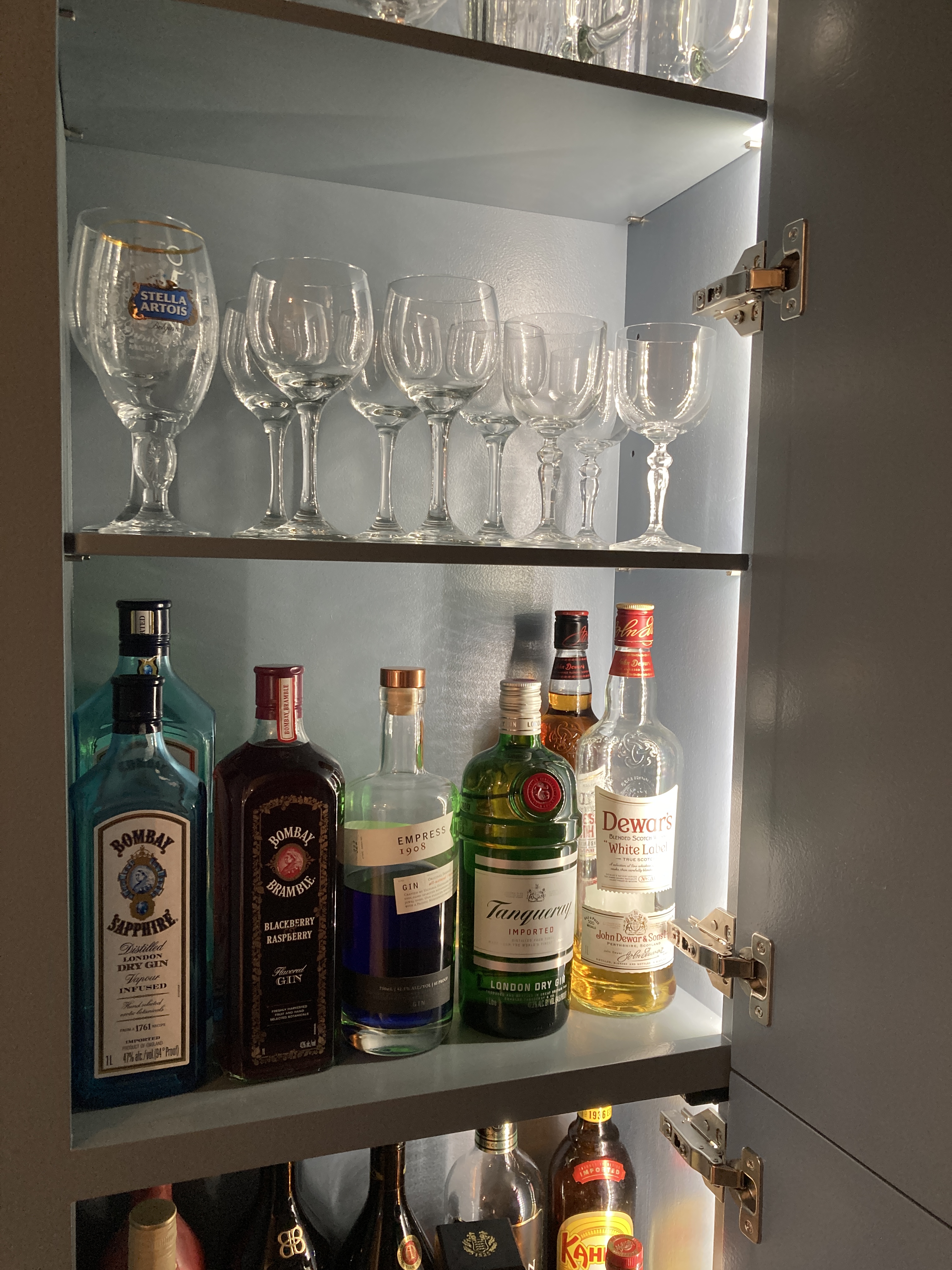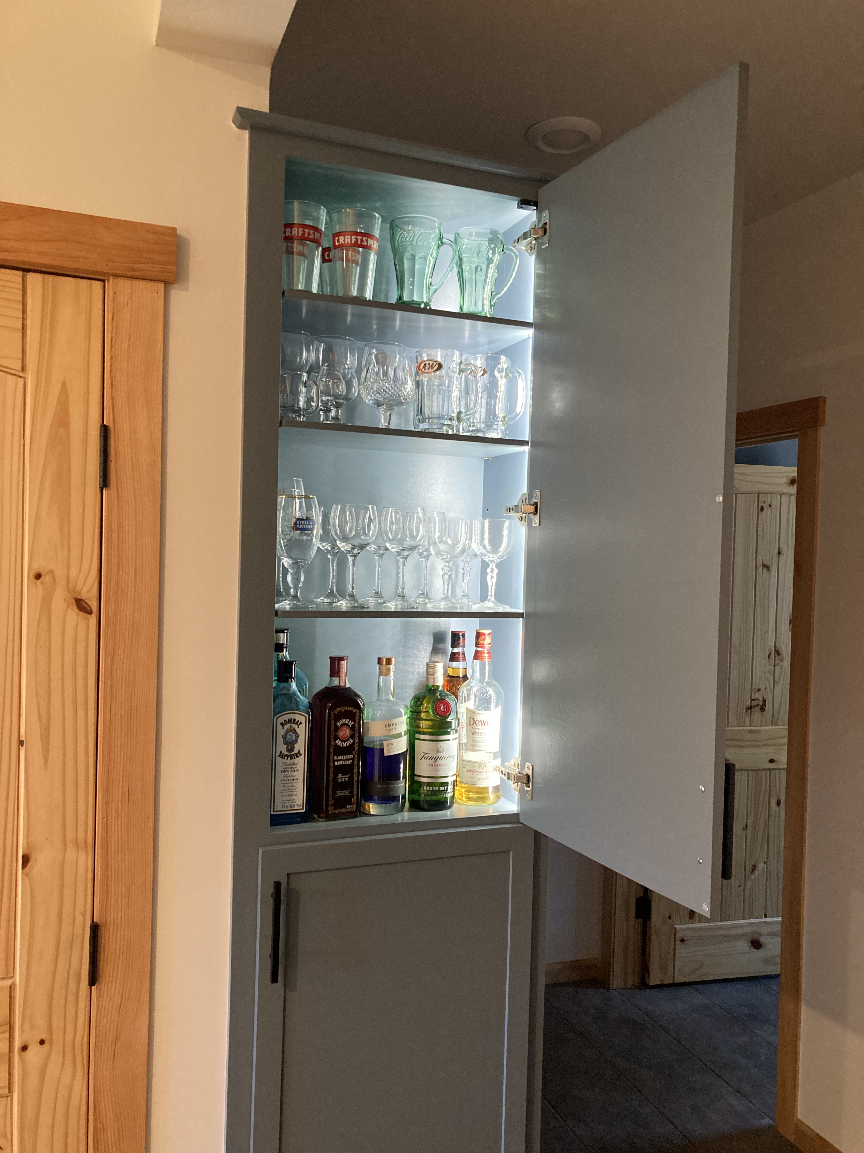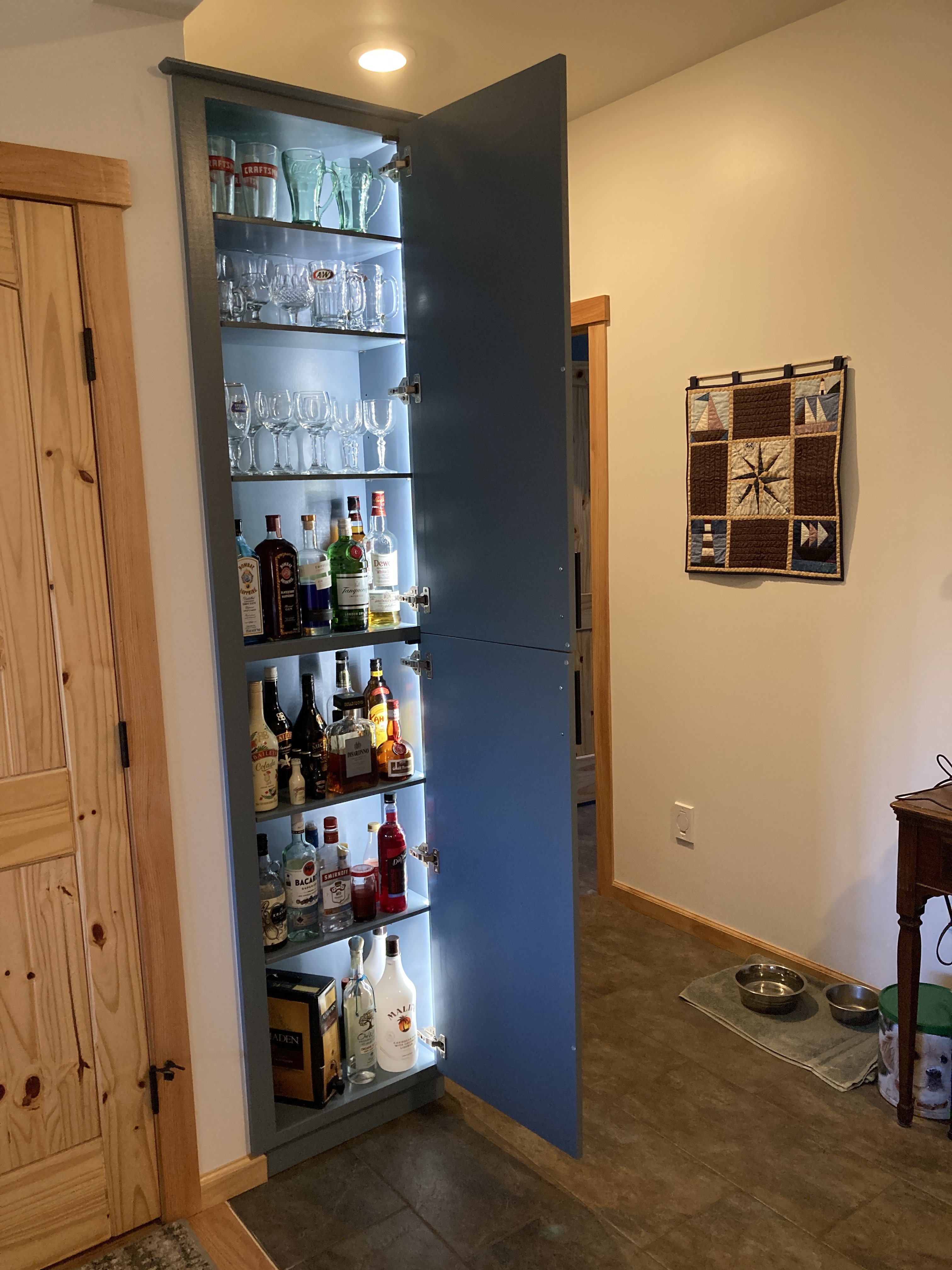 This liquor and glassware cabinet features LED lighting that automatically turns on when either the upper or lower door is opened. Adjustable shelves accommodate different size contents.